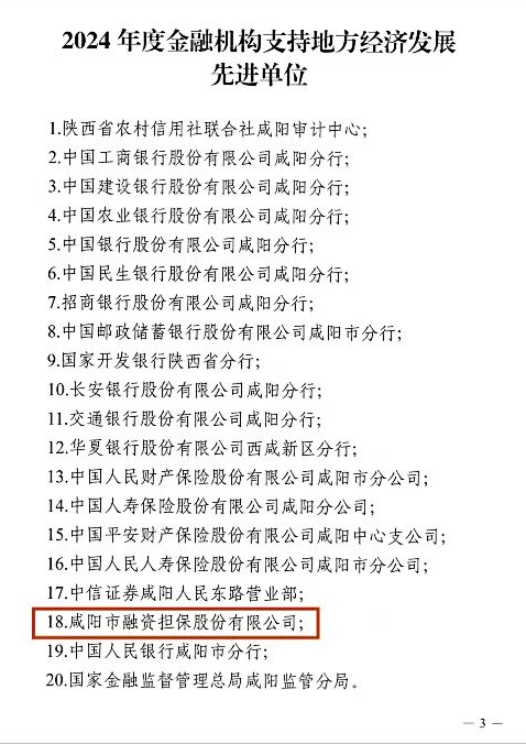 再获殊荣!咸阳财金重点子公司市融资担保公司荣获2024年度“金融机构支持地方经济发展先进单位”荣誉称号