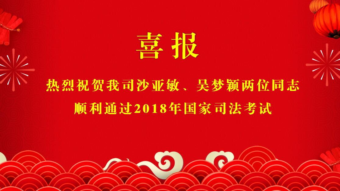 11月30日,是2018年国家司法考试成绩公布的日子。功夫不负有心人,经过一年的踏实备战,我司沙亚敏同志以310分、吴梦颖同志以336分的可喜成绩,顺利通过国家司法考试。 国家司法考...